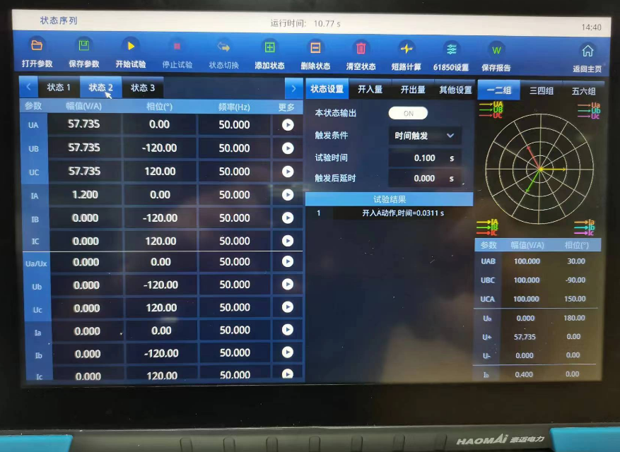 狀態(tài)2設(shè)置: UA=UB=UC=57.734V,IA=1.05A,電壓電流均為正序,觸發(fā)方式: 時(shí)間觸發(fā)100ms。