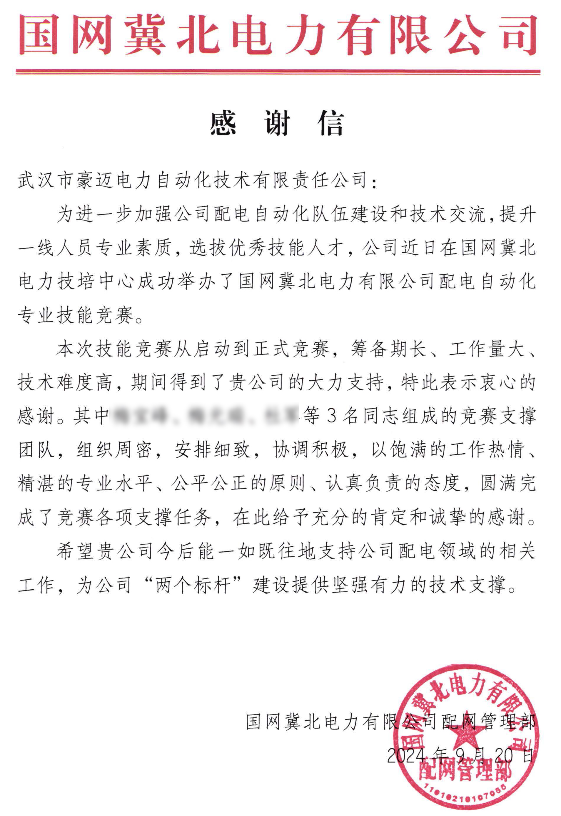 近日,武漢豪邁收到國網(wǎng)冀北電力發(fā)來的感謝信,信中對武漢豪邁安排員工“組成競賽支撐團(tuán)隊(duì),組織周密,安排細(xì)致,協(xié)調(diào)積極,以飽滿的工作熱情,精湛的專業(yè)水平、公平公正的原則、認(rèn)真負(fù)責(zé)的態(tài)度,圓滿完成了競賽各項(xiàng)支撐任務(wù),給予充分的肯定和誠摯的感謝”。字里行間蘊(yùn)藏著客戶對我司產(chǎn)品品質(zhì)、技術(shù)實(shí)力、服務(wù)能力的高度認(rèn)可與滿滿信任,既是榮譽(yù),也是鞭策,更是動力。