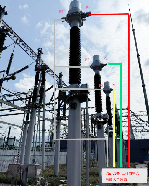 HTA-3300?三相數(shù)字式智能大電流源一次試驗(yàn)線應(yīng)可靠連接分段224開關(guān)CT一次側(cè)極性端P1,一次通流經(jīng)過CT后從P2流出,形成“P1—CT—P2”可靠回路(見下圖)。