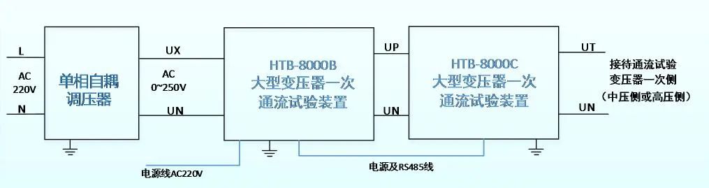 通流試驗(yàn)接線: 將單相調(diào)壓器、HTB-8000B、HTB-8000C串接為A相輸出接線,B/C兩相同理,3臺單相自耦調(diào)壓器工作電源為AC380V(空開不小于16A),三相分別使用A/B/C的火線,零線共用(保證輸出120°相角差)。 HTB-8000B接入工作電源AC220V(10A),HTB-8000B與HTB-8000C通過電源與通訊共用航插線連接,各相之間無其他物理連接,系統(tǒng)輸出接入變壓器通流側(cè)。