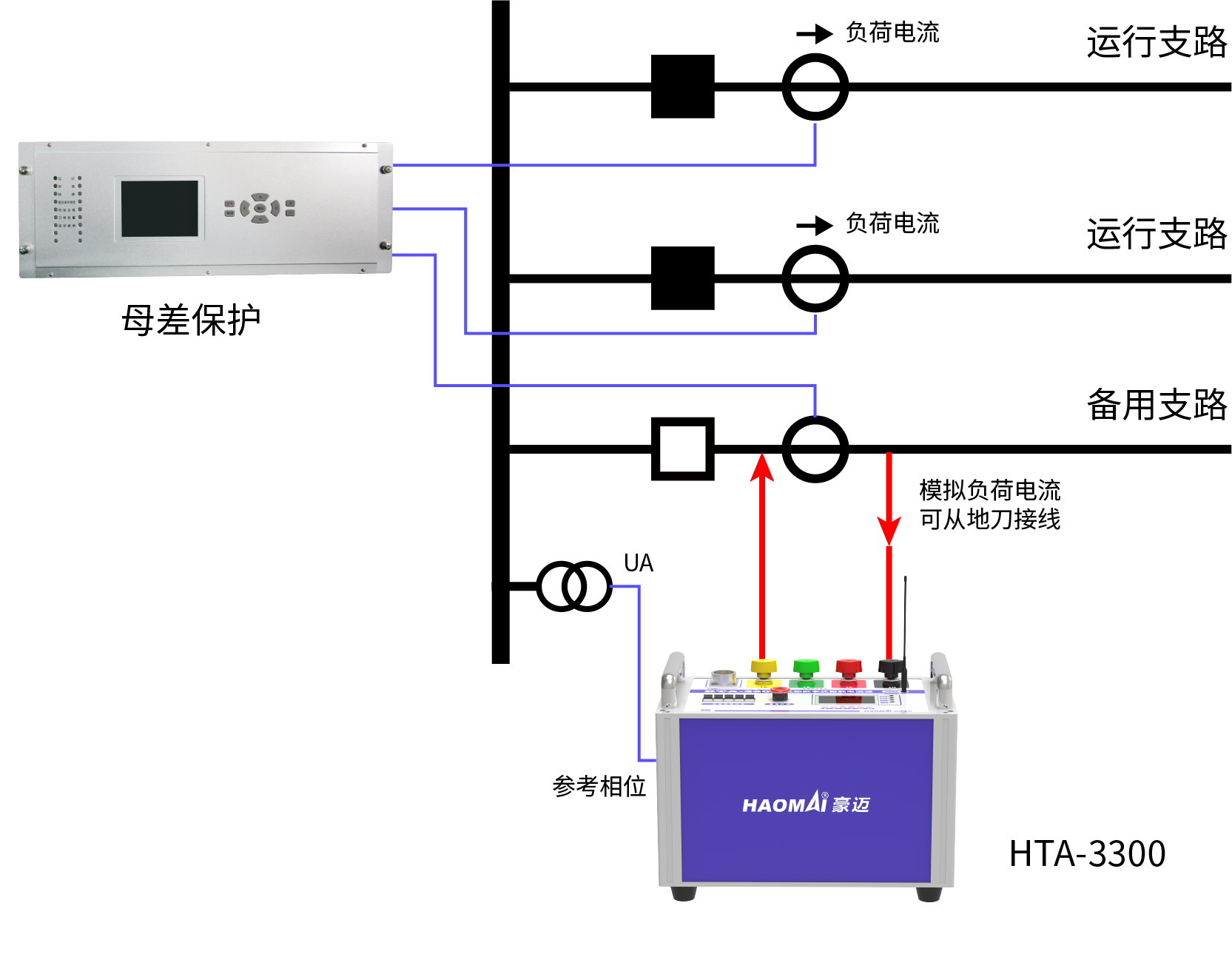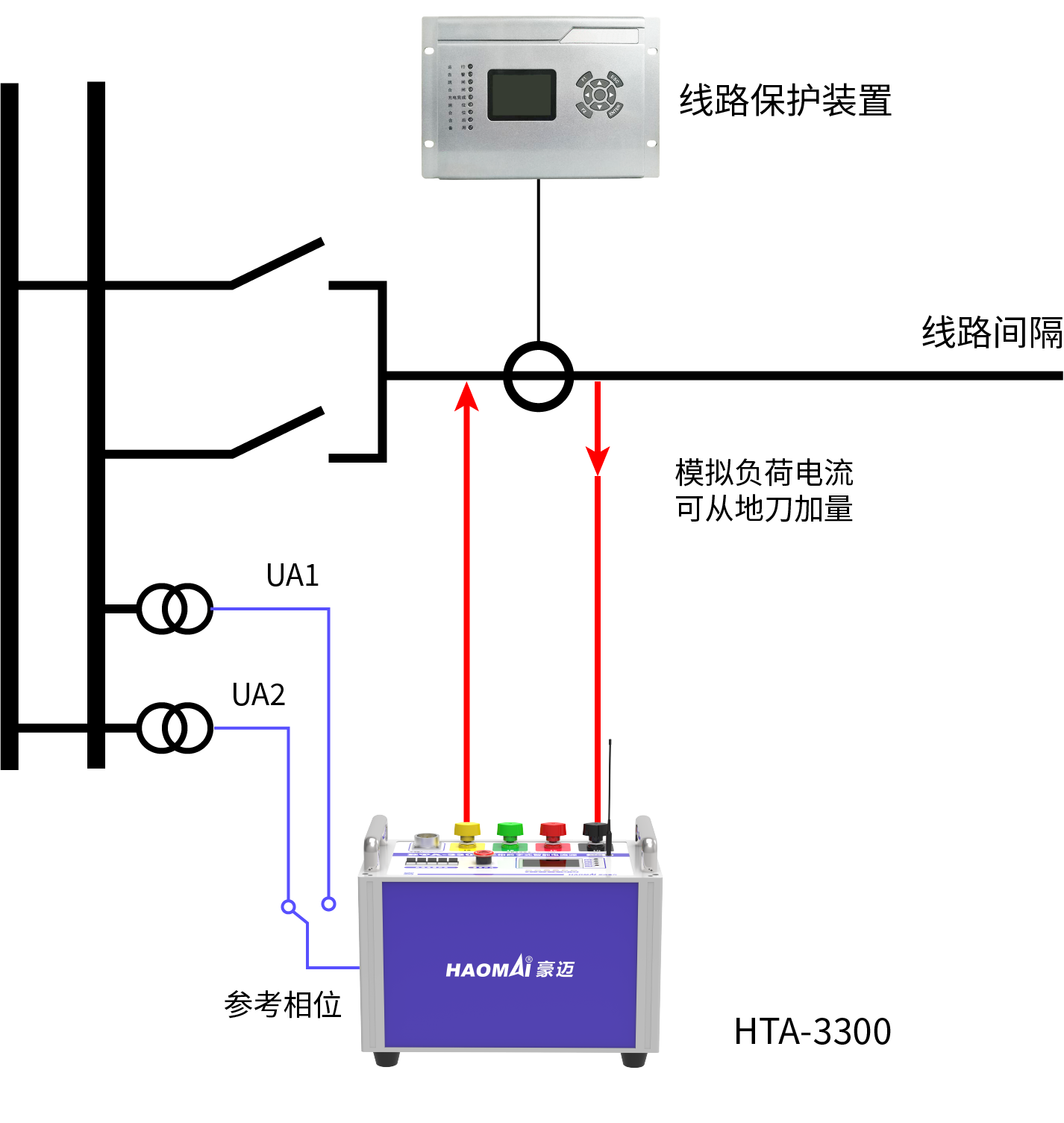 雙母線系統(tǒng)線路間隔停電更換保護,可以采用HTA-3300 三相數(shù)字式智能大電流源輸出0-300A電流加到CT一次側(cè),該電流分別與兩段母線PT的二次運行電壓UA1、UA2同步,模擬線路間隔分別接入兩段母線時的負荷電流,用于對該間隔的二次回路的向量檢查, 也可模擬輸出零序電流用于檢查N線。