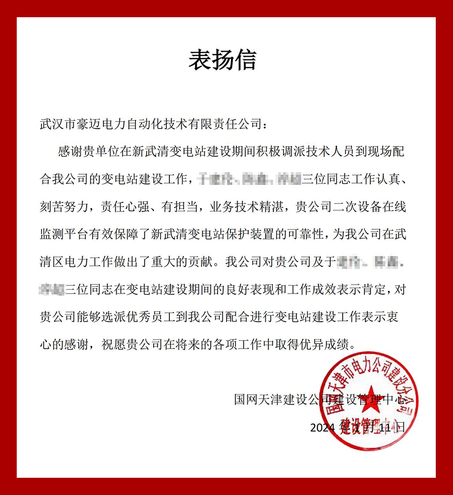 武漢豪邁對國網(wǎng)天津建設(shè)公司長期以來給予的信賴與支持表示衷心感謝,表揚信背后,是認(rèn)可,是鼓勵,更是責(zé)任。