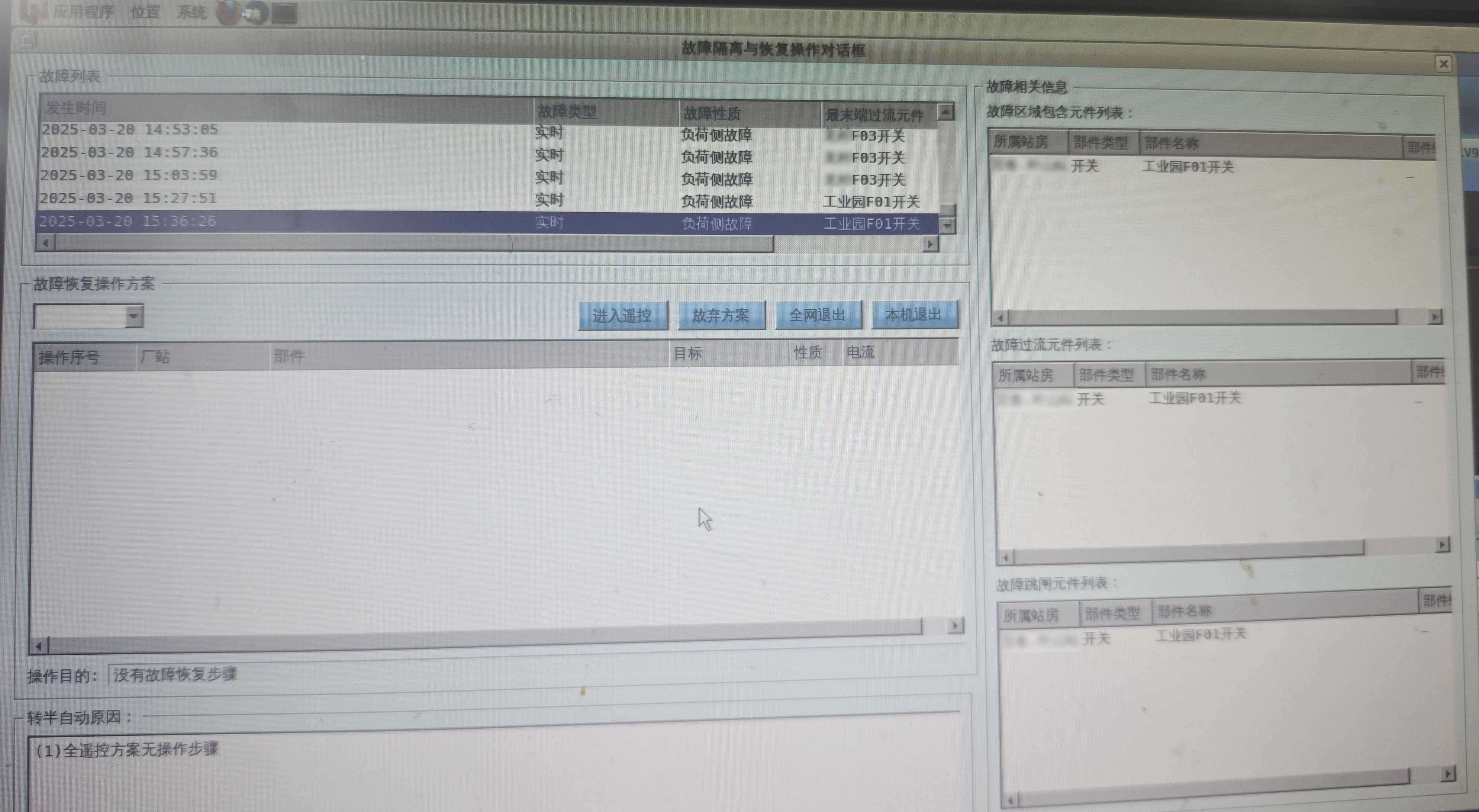 工業(yè)園F01開關(guān)保護分閘,重合與故障跳開,恢復(fù)供電方案為“無”。