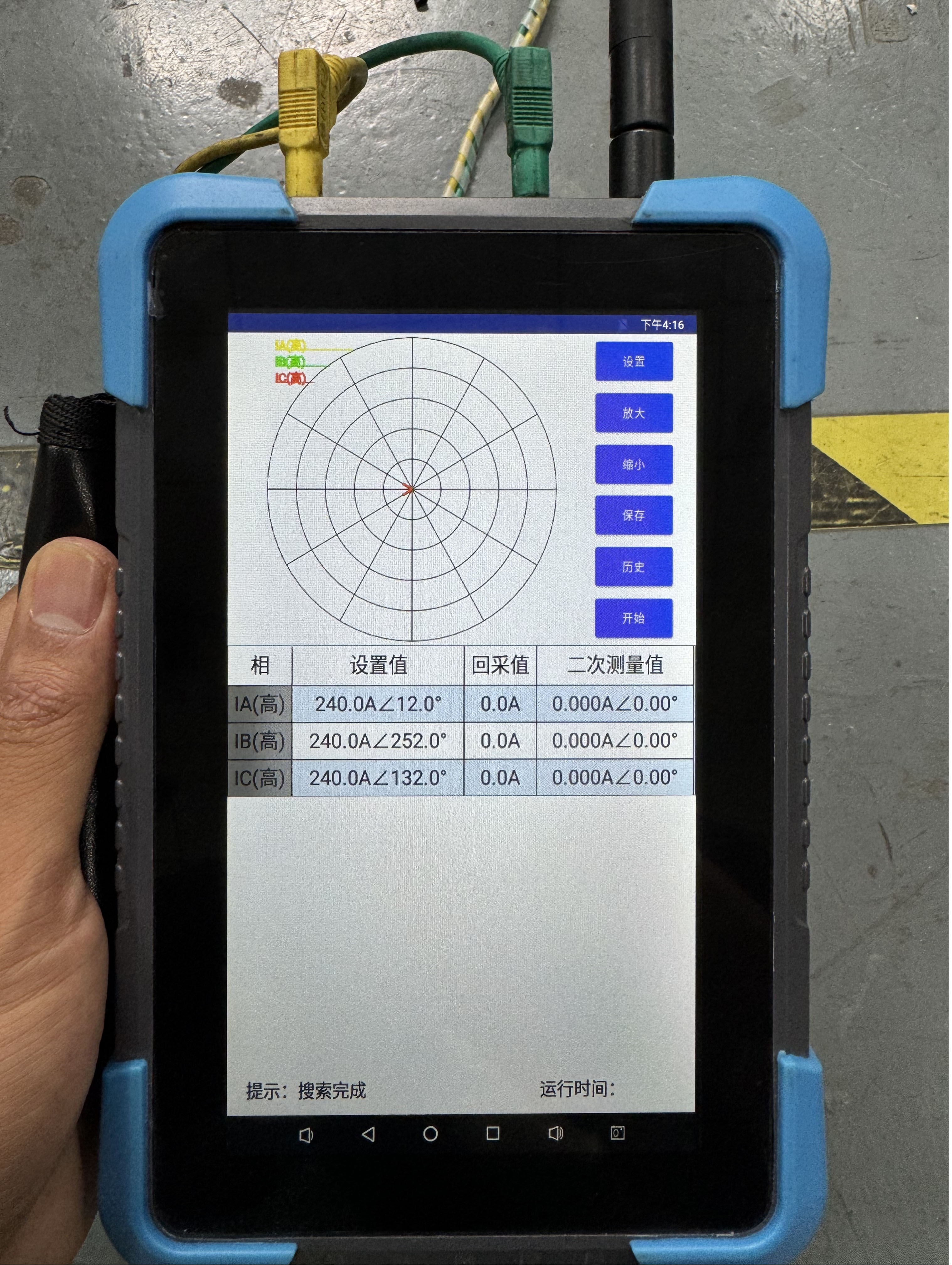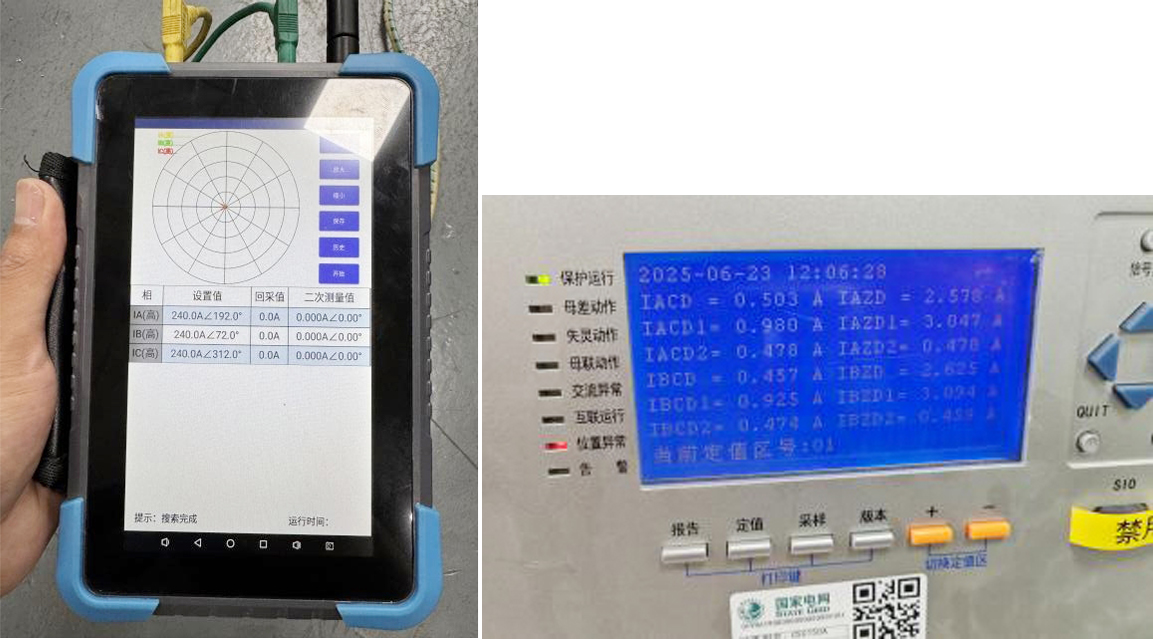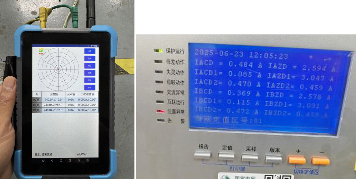使用 HTA-3300 加量模擬該間隔電流施加到母聯(lián)開關(guān)CT上:將 HTA-3300 運行設(shè)置選擇為遙控模式,用YD-300E 搜索對應(yīng)設(shè)備,連接完成后設(shè)置輸出的幅值與角度,與天文一線同輻值角度輸出,然后返回遙控主界面,點擊開始,即可控制連接上的裝置進行輸出。