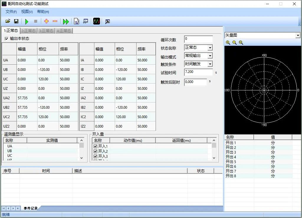 打開(kāi)配網(wǎng)自動(dòng)化測(cè)試系統(tǒng),點(diǎn)擊主界面“功能測(cè)試”,配置測(cè)試項(xiàng)目的狀態(tài)序列,并命名保存。