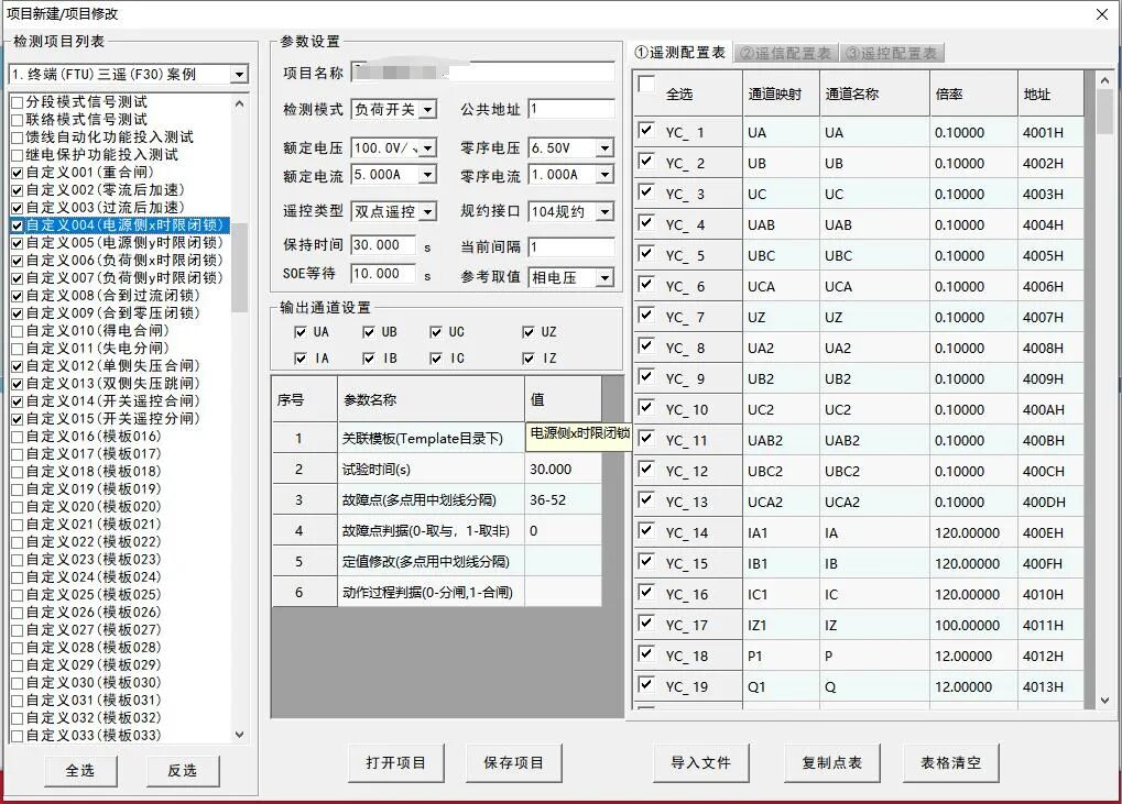 打開(kāi)“項(xiàng)目管理”配置測(cè)試案例、FTU或DTU基本參數(shù)、額定電壓、額定電流、零序電壓、零序電流、保持時(shí)間、SOE等待時(shí)間、遙測(cè)、遙信點(diǎn)表。