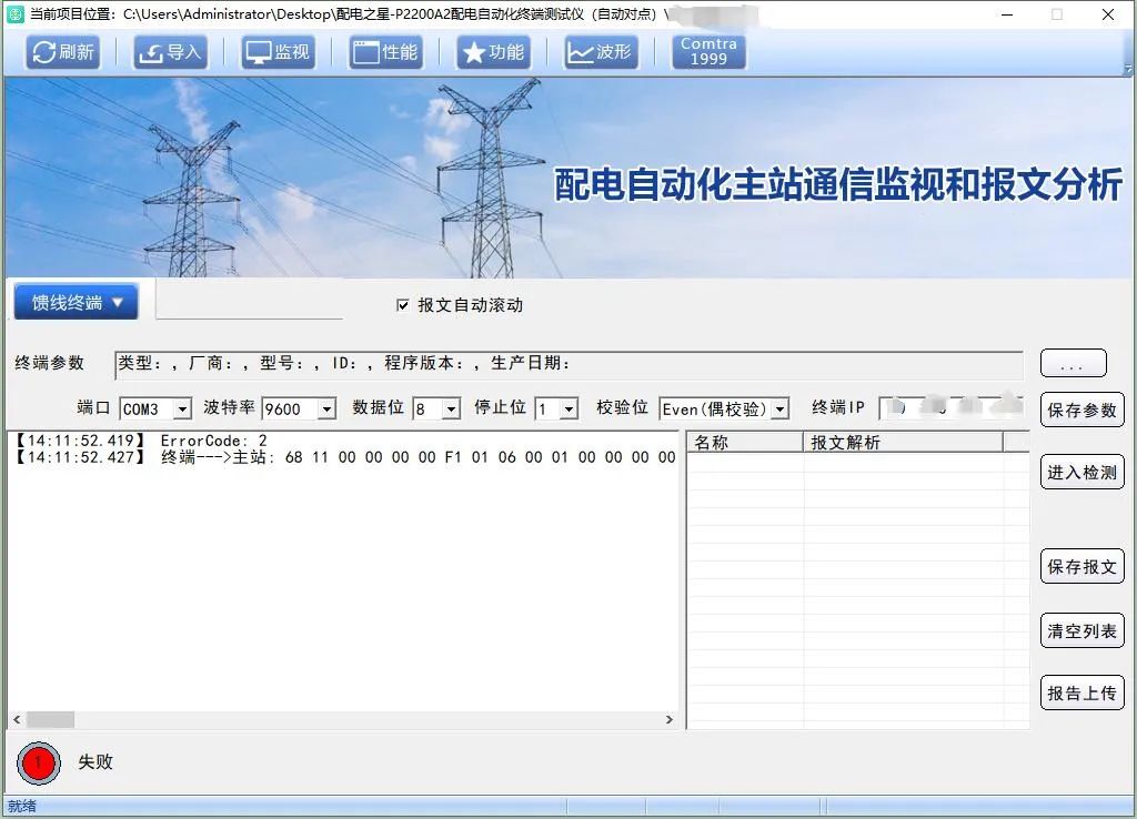 測(cè)試項(xiàng)目配置完成后,返回主界面點(diǎn)擊配網(wǎng)測(cè)試,導(dǎo)入配置的測(cè)試案例,填寫(xiě)通訊模塊與測(cè)試儀相連接的串口、波特率、數(shù)據(jù)位、停止位、校驗(yàn)位、終端SIM卡IP,填寫(xiě)完畢后點(diǎn)擊保存與刷新。當(dāng)收到主站回復(fù)時(shí),黃色與綠色提示燈交替閃爍,表示與主站通訊已建立,可進(jìn)行自動(dòng)對(duì)點(diǎn)測(cè)試。