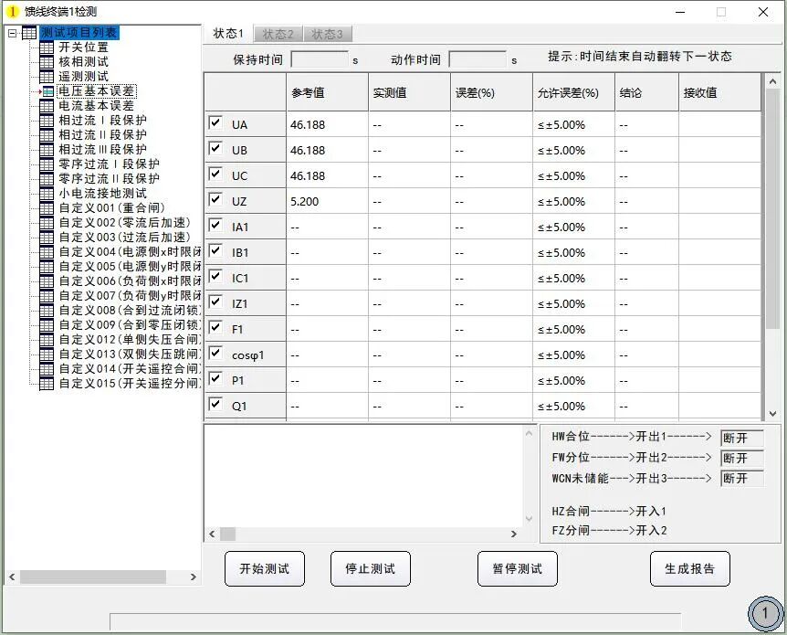 以往配電終端聯(lián)調(diào)時(shí)對(duì)點(diǎn)調(diào)試需根據(jù)點(diǎn)表描述,手動(dòng)進(jìn)行多狀態(tài)組合控制輸出,并逐項(xiàng)上送點(diǎn)位數(shù)據(jù),武漢豪邁配網(wǎng)自動(dòng)化測(cè)試系統(tǒng)可自動(dòng)完成終端對(duì)點(diǎn)測(cè)試,支持自定義測(cè)試項(xiàng)目,新增測(cè)試模板,實(shí)現(xiàn)狀態(tài)序列靈活配置,一鍵完成自動(dòng)對(duì)點(diǎn)測(cè)試。