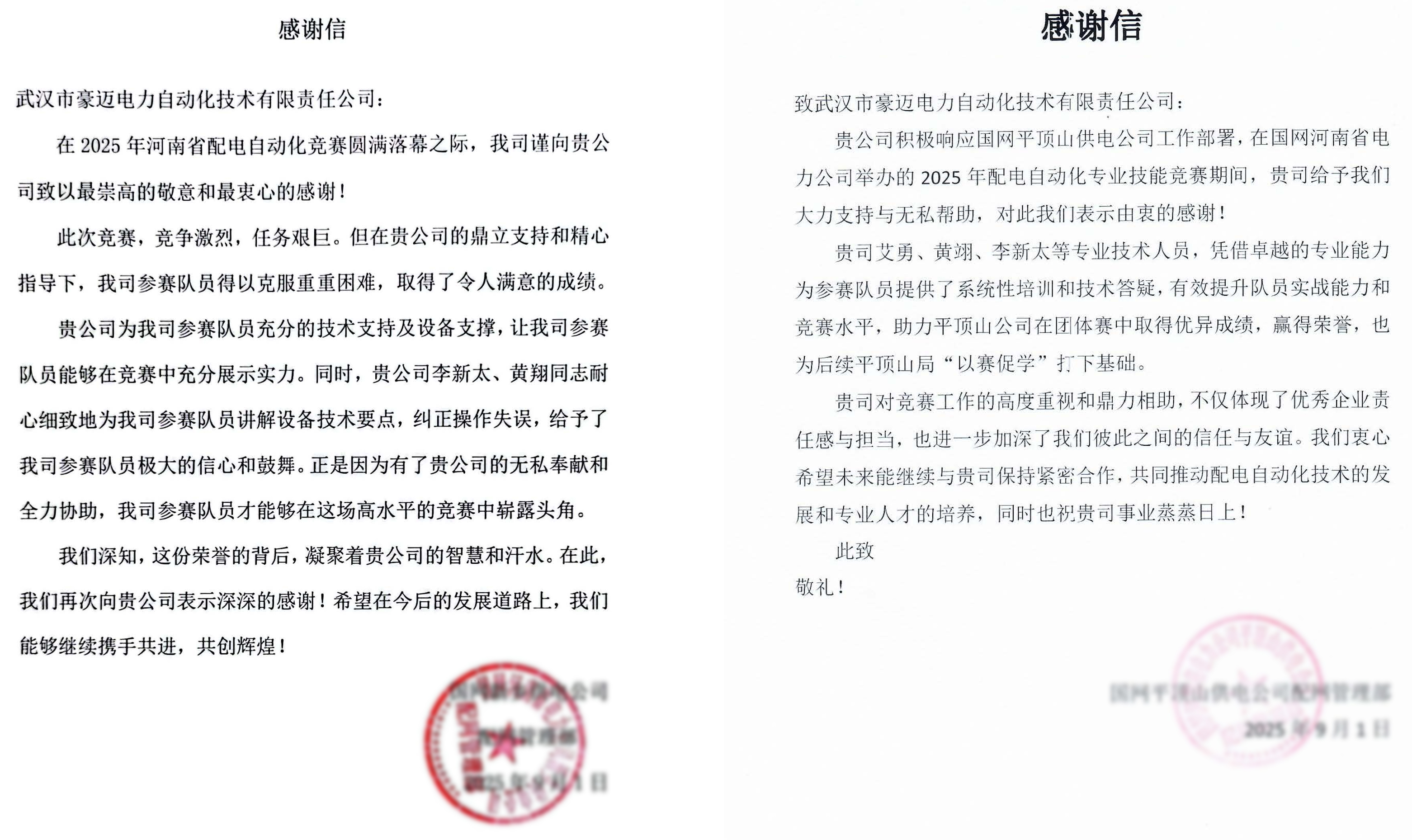 賽后,國網(wǎng)河南省電力多家供電公司陸續(xù)發(fā)來感謝信,對武漢豪邁的技術(shù)服務表示高度認可。信中特別強調(diào),公司提供的設(shè)備支撐和技術(shù)指導,為參賽選手提供了優(yōu)質(zhì)的學習資源,通過耐心講解設(shè)備要點、分析糾正操作失誤,顯著提升了選手的實戰(zhàn)能力,為競賽取得優(yōu)異成績提供了有力保障。武漢豪邁對此深表感謝,并將繼續(xù)以優(yōu)質(zhì)的產(chǎn)品和服務回報用戶的信任與支持。