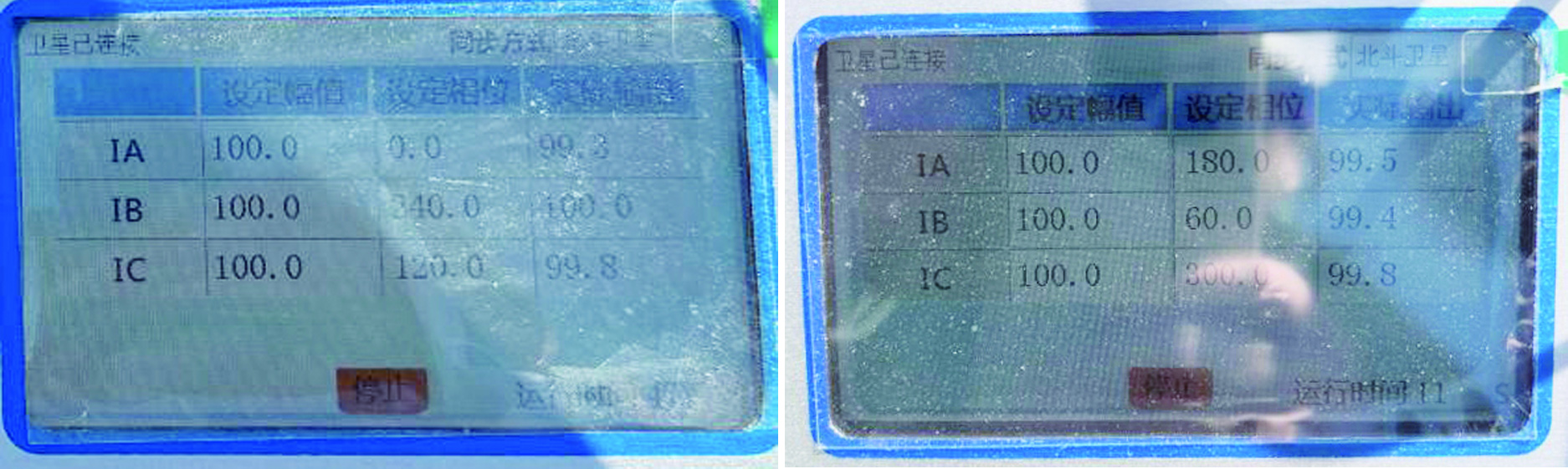 試驗(yàn)設(shè)備開機(jī)后,選擇 GPS 對(duì)時(shí)方式,兩站之間可通過(guò) GPS 同步對(duì)時(shí)。對(duì)上時(shí)后按照變電站側(cè)電流源一次施加電流 A 相 100A ∠ 0 °, B 相 100A ∠ 240 °, C 相 100A ∠ 120 °,風(fēng)電場(chǎng)側(cè)電流源一次施加電流 A 相 100A ∠ 180 °, B 相 100A ∠ 60 °, C 相 100A ∠ 300 °分別輸出,通過(guò) 秒脈沖同步觸發(fā),保證過(guò)零時(shí)刻兩邊電流輸出相位同步。 在保護(hù)裝置 查看采樣和差流,完成線路差動(dòng)保護(hù)向量校核試驗(yàn)。